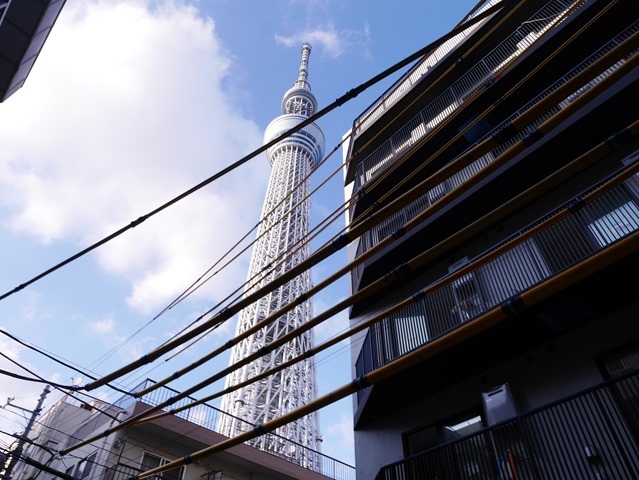スカイツリー周辺は下町だけあって電線がすごい。一部では電線地中化工事が進んでいます。